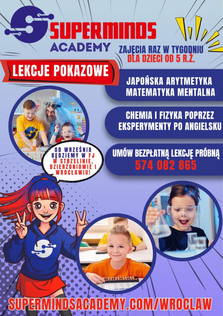Z radością ogłaszamy, że w naszych placówkach Fabryki Języka (Wrocław, Strzelin, Dzierżoniów) startują zajęcia z matematyki arytmetycznej Superminds Academy!